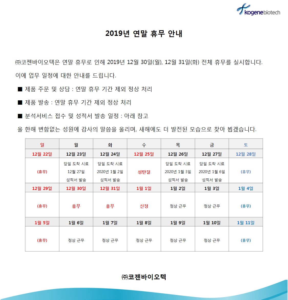 공지 및 뉴스 [공지] 2019년 연말 휴무 안내 2019-12-19 이전글 [채용공고] 2020 각 부문 경력/신입 정기채용 다음글 [뉴스] 코젠바이오텍, 2019년 송년의밤 목록으로