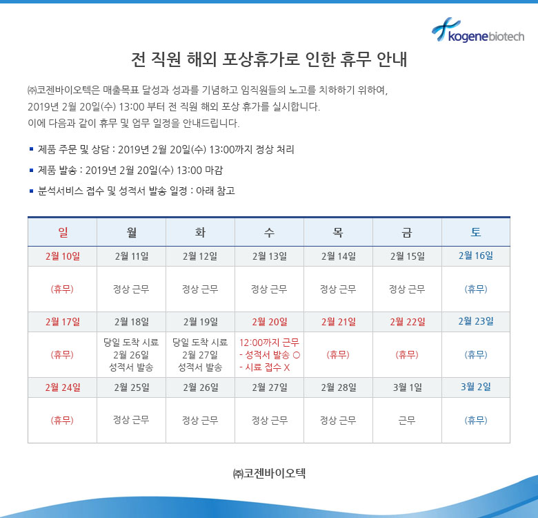 [공지] 전 직원 해외 포상휴가로 인한 휴무 안내 2019-02-25 이전글 [보도/매경] 코젠바이오텍 "유전자 진단키트로 분자진단 선도” 다음글 [뉴스] 2019 푸켓 포상휴가 목록으로