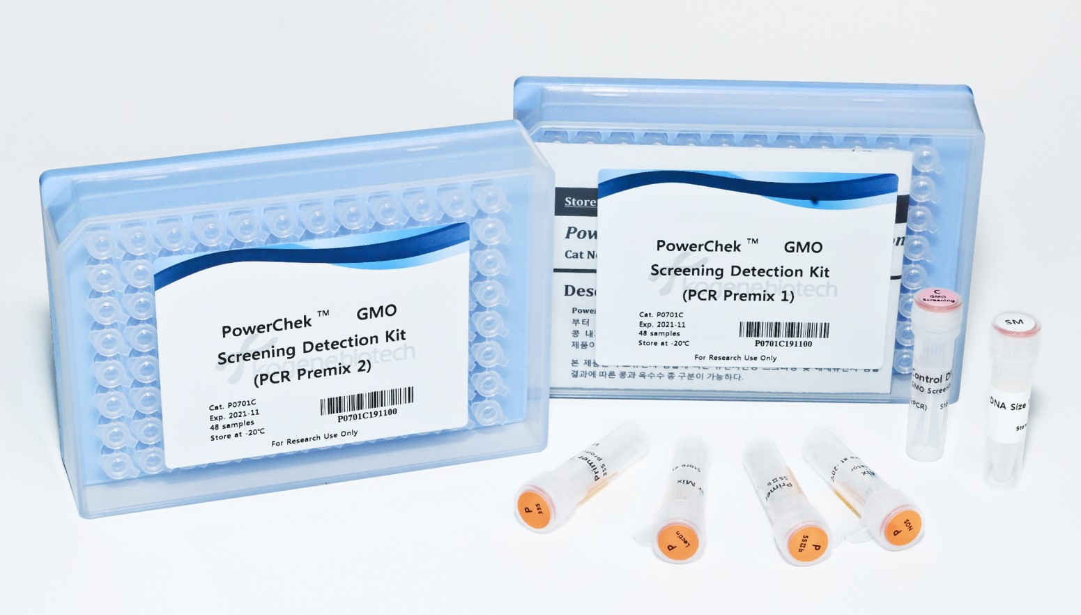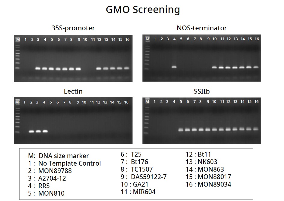 본 제품군은 범용적인 스크리닝 검사에 적합한 35S-promoter, NOS-terminator, bar, FMV, Plant reference gene 검출 시스템을 포함하는 Universal GMO Screening Kit와 콩, 옥수수 각각의 내재 유전자의 검출이 가능한 GM-Soy screening과 GM-Maize screening 키트를 포함하고 있습니다.